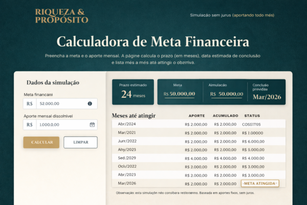 A Calculadora de Meta Financeira é uma ferramenta prática e elegante para quem deseja transformar objetivos em planos reais. Com ela, você informa sua meta financeira e o valor de aporte mensal, e a calculadora mostra automaticamente em quantos meses o objetivo será alcançado, a data estimada de conclusão e uma tabela completa com o acumulado mês a mês.